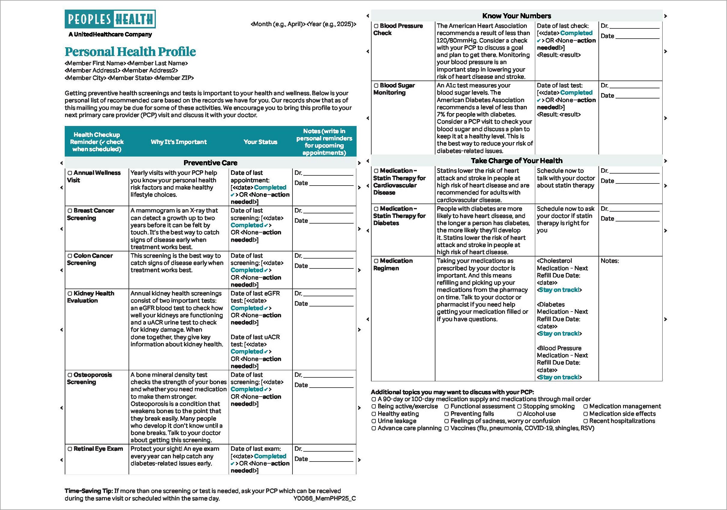 We’re conducting targeted outreaches to our plan members throughout the year to stress the importance of certain activities, including getting needed health screenings and tests. We’ve developed postcards and emails to deliver reminder messaging to those due for the following activities. As a companion to these efforts to close gaps in care, we’ve also designed a personalized health profile of the activities a member may be due for, presented in an easy-to-read chart format. Members who are eligible and noncompliant for at least one of 11 measures will be sent a health profile via mail in May. Your patients may talk with you about the communications we send or ask questions about these topics. Please encourage them to complete the activities.